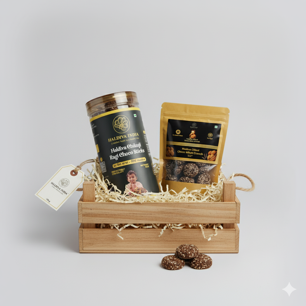 This Healthy Choco Snack Combo is made for families who want tasty treats without artificial flavours or harmful additives. It combines Chikuji Ragi Choco Sticks (100 g) and ChocoMillet Crunch (200 g)—both crafted using natural, millet-based ingredients for a clean snacking experience. Perfect for kids, teens and chocolate lovers who want something delicious yet healthier than regular junk snacks.