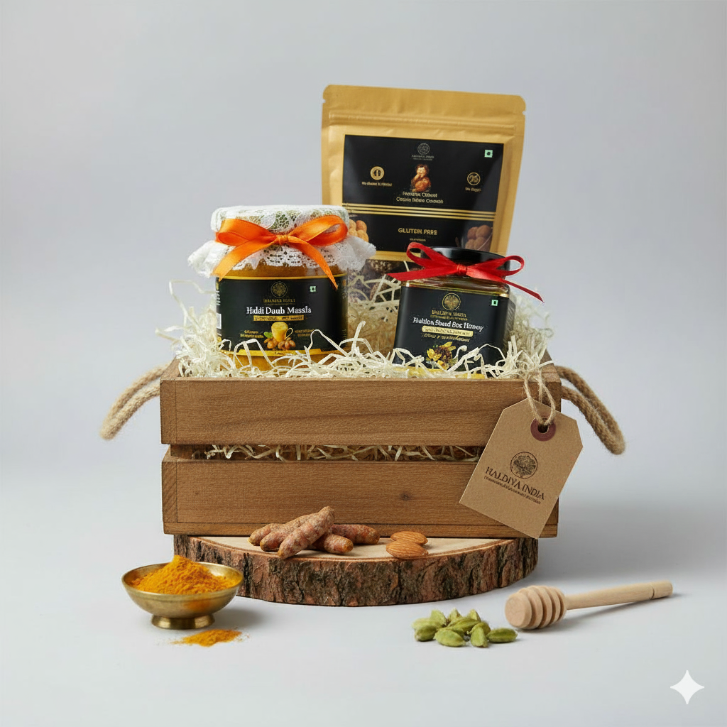 This Pure & Natural Wellness Combo brings together three clean, chemical-free and immunity-supporting foods: Haldi Dudh Masala (150 g), Phool Ras Honey (150 g) and Sesame Cookies (200 g). Each product is made with natural ingredients - no artificial colours, no preservatives, no processed sugar substitutes - making it safe for daily consumption by kids and adults.